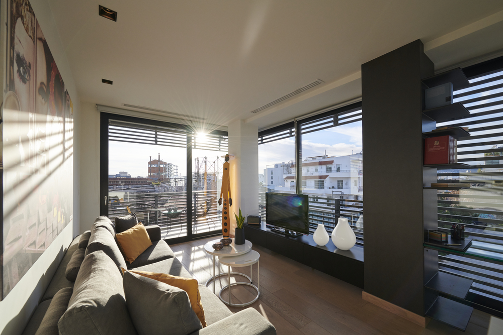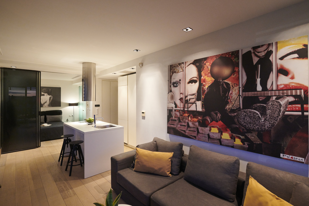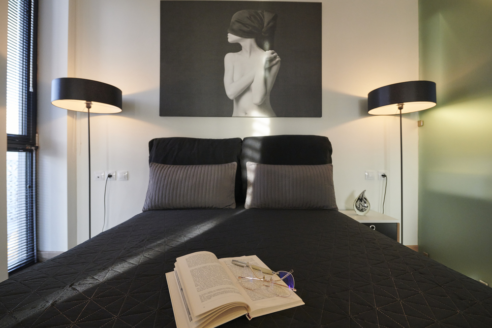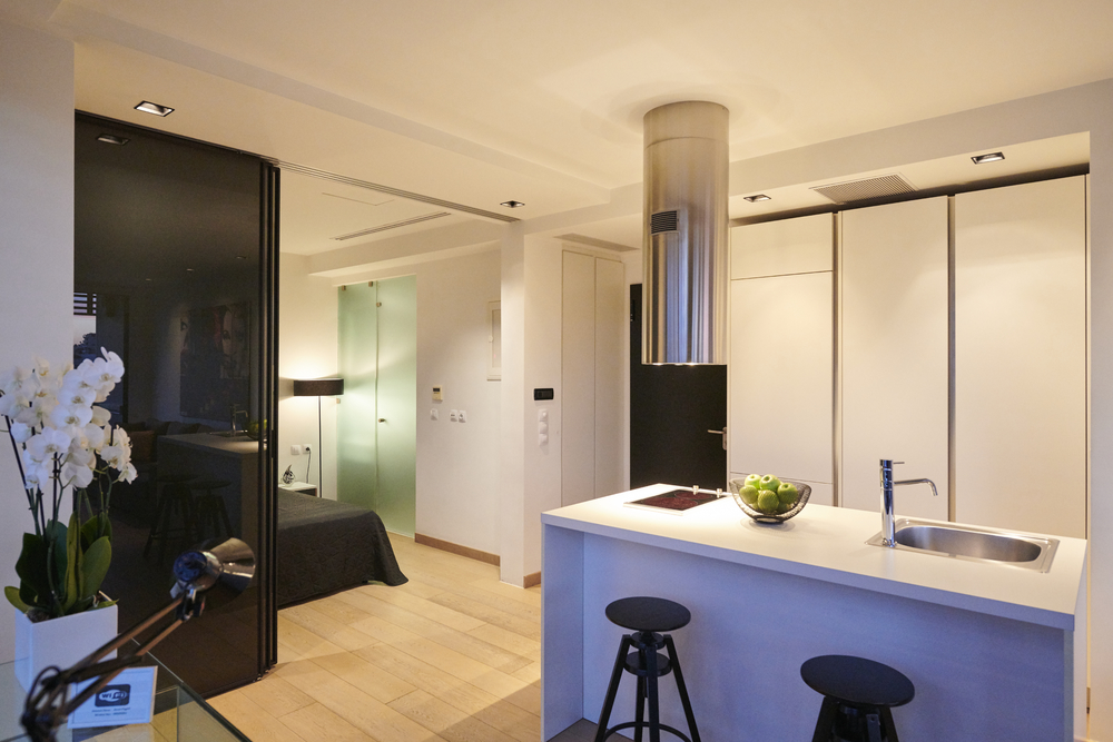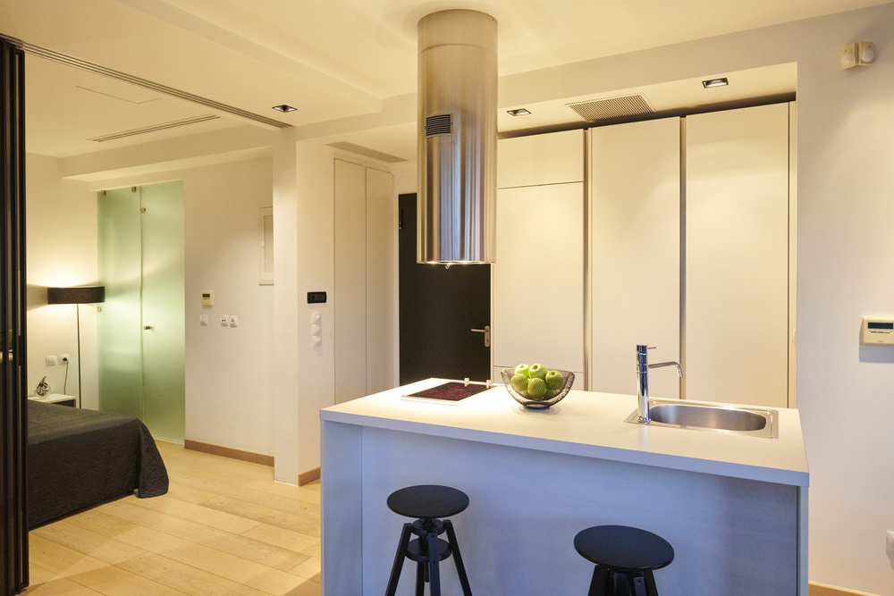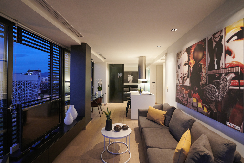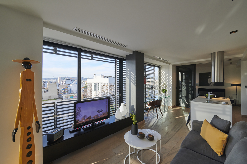 It is an open plan apartment consisted by one bedroom, one bathroom, a kitchen and a living room. The bedroom can be separated through very sophisticated plexiglass sliding doors that will ensure your privacy if needed. The bathroom is separated by a modern glass door.
