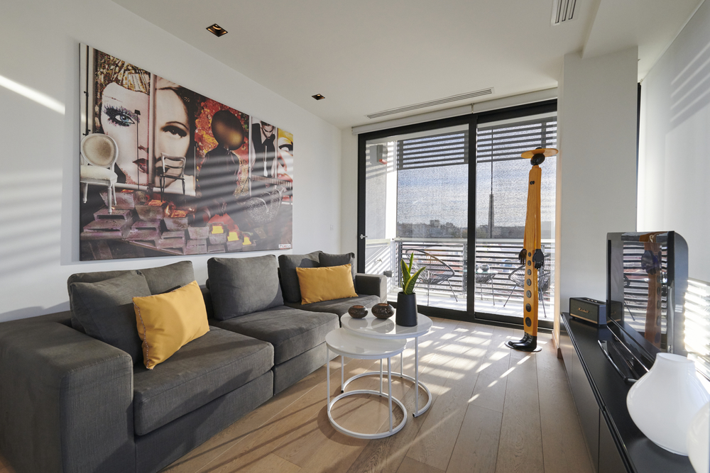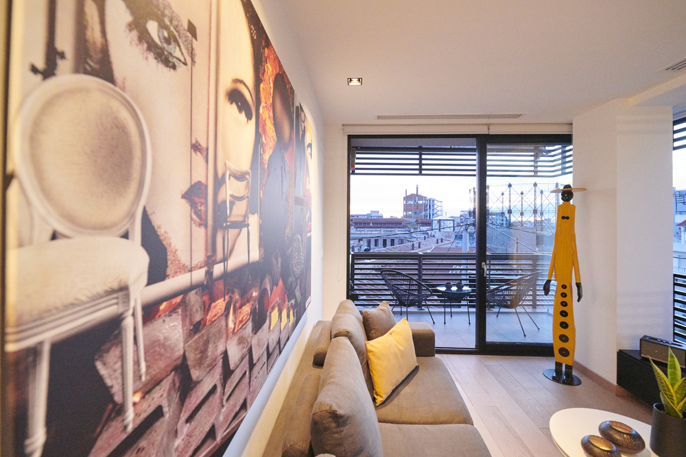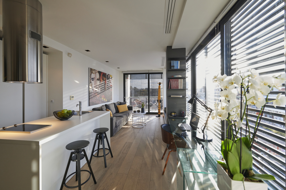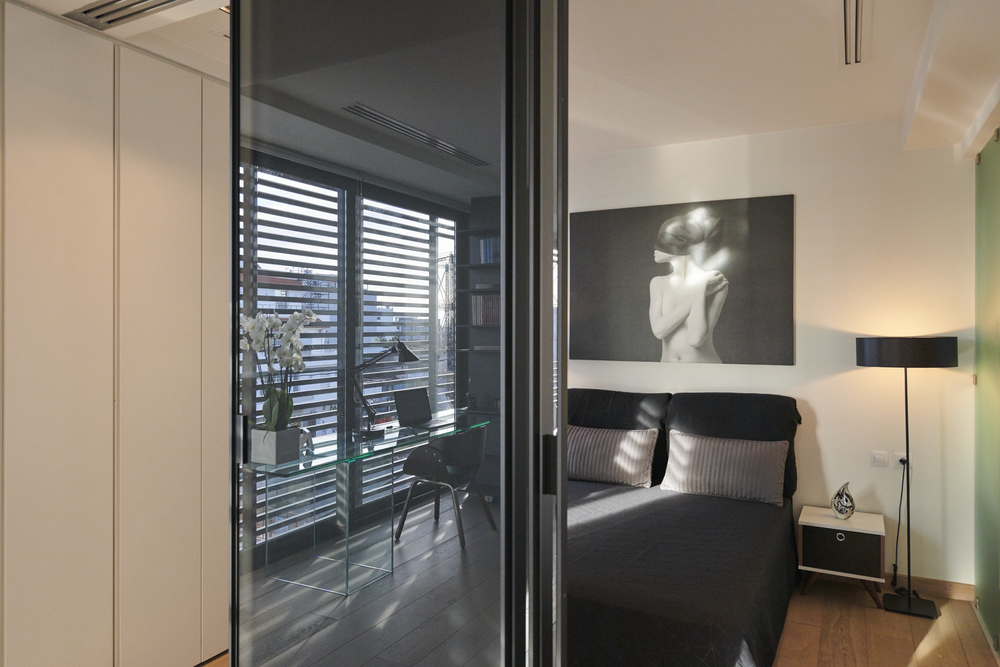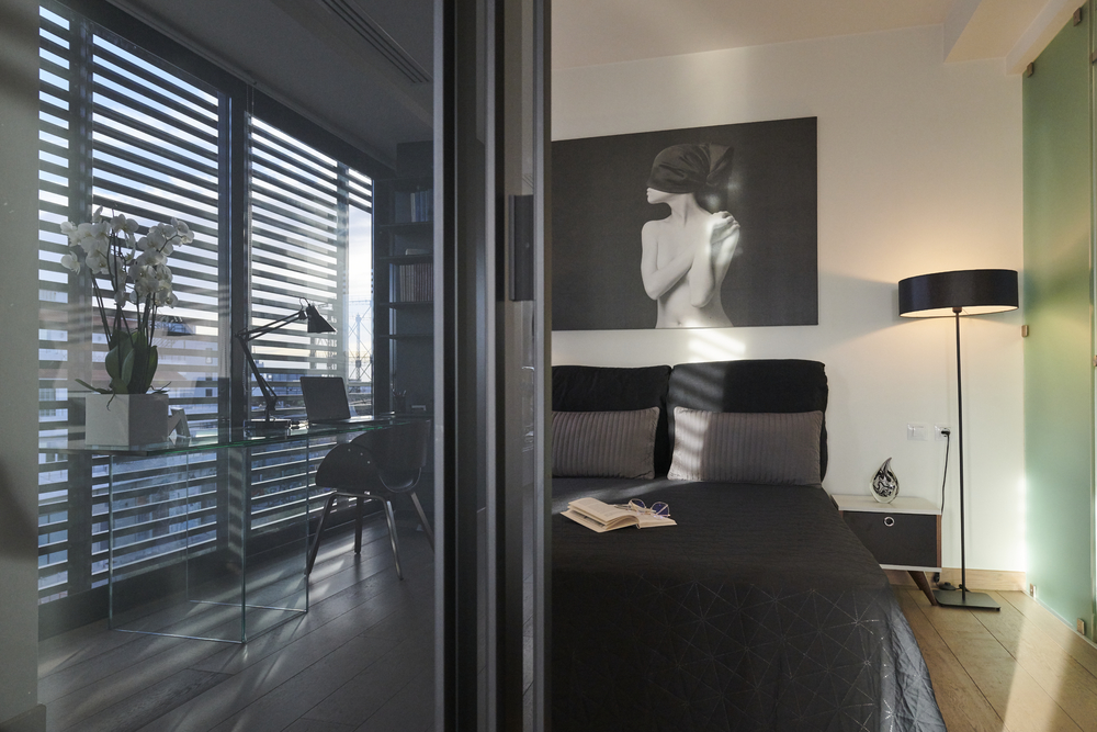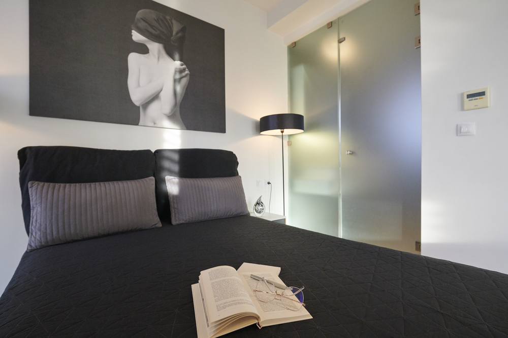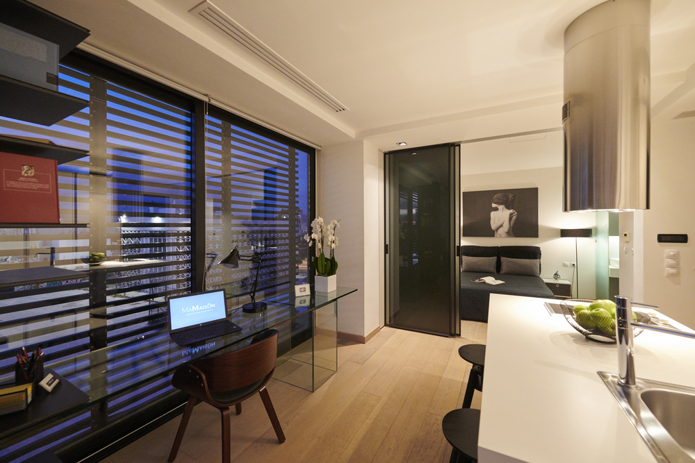 It is an open plan apartment consisted by one bedroom, one bathroom, a kitchen and a living room. The bedroom can be separated through very sophisticated plexiglass sliding doors that will ensure your privacy if needed. The bathroom is separated by a modern glass door.