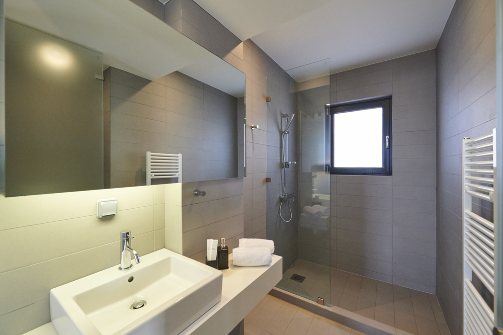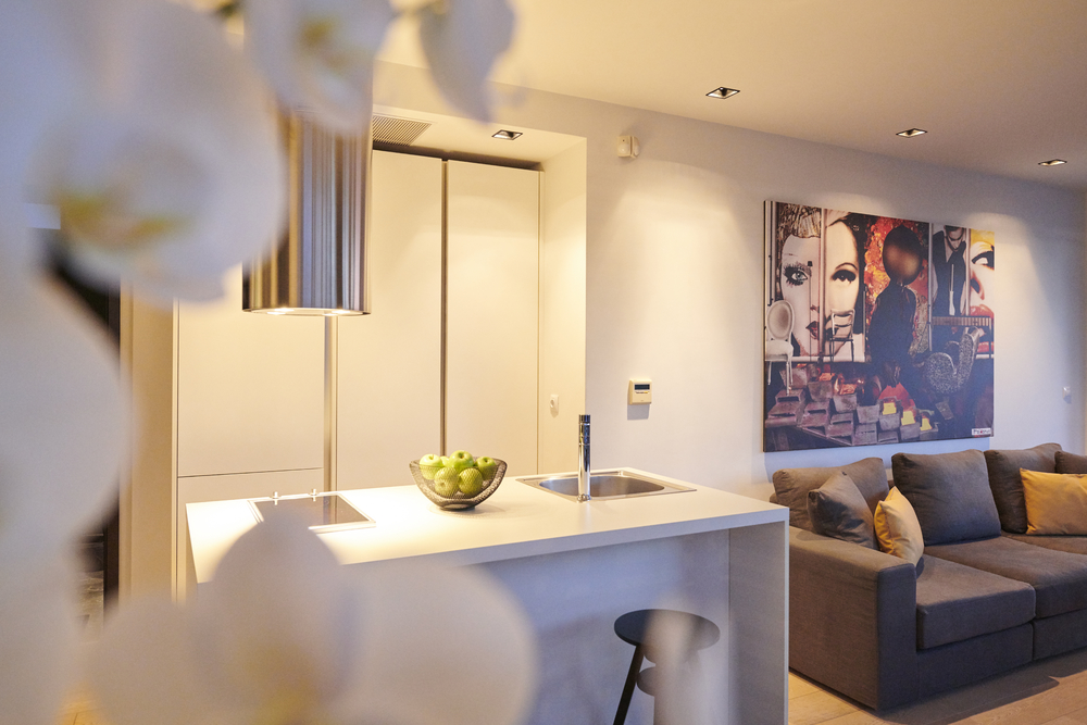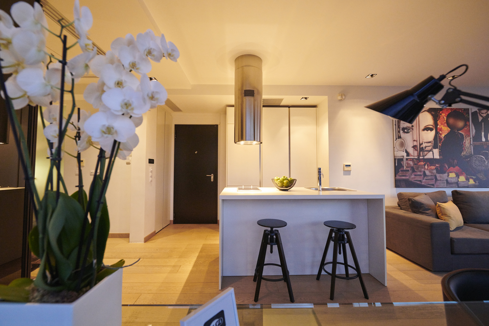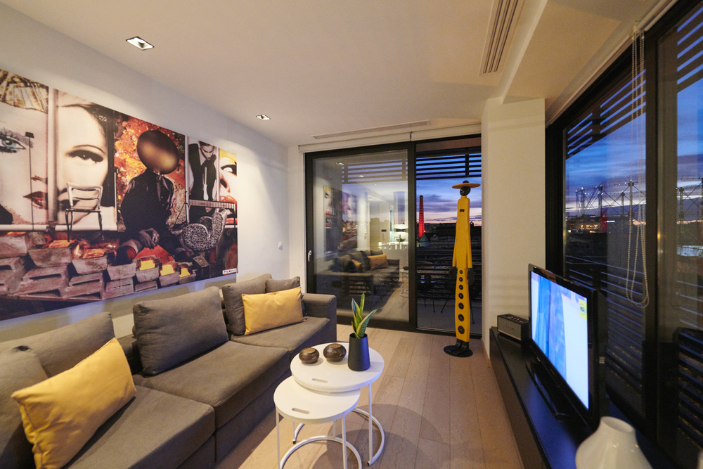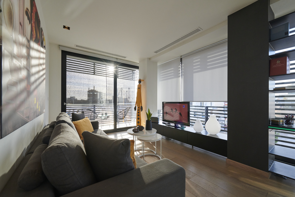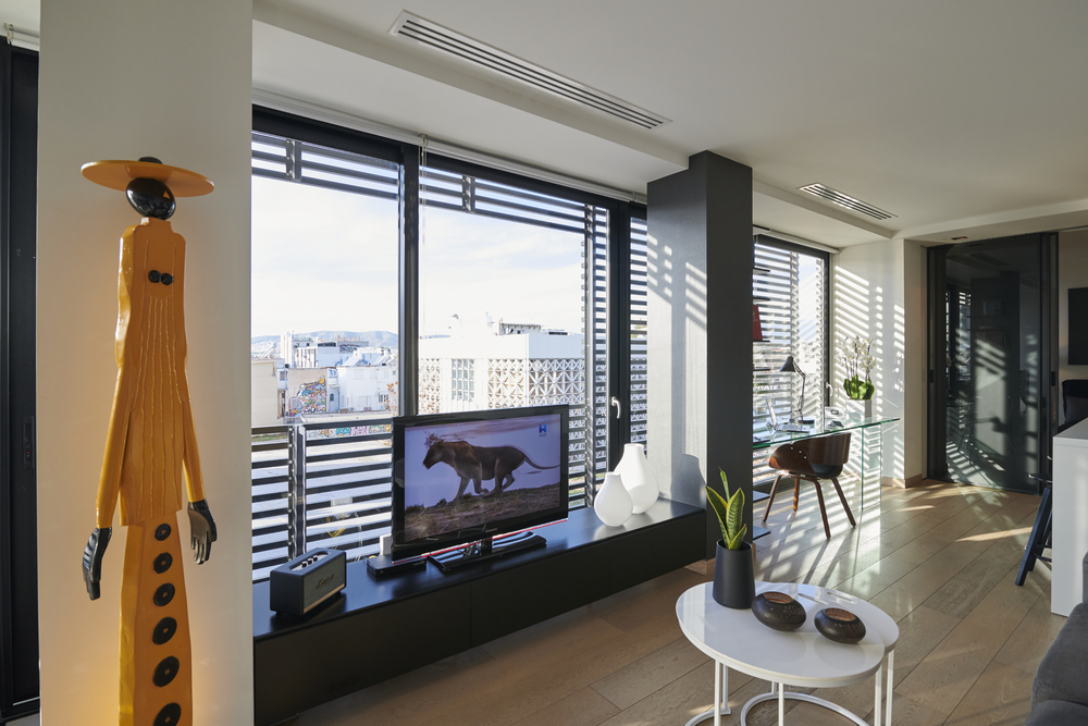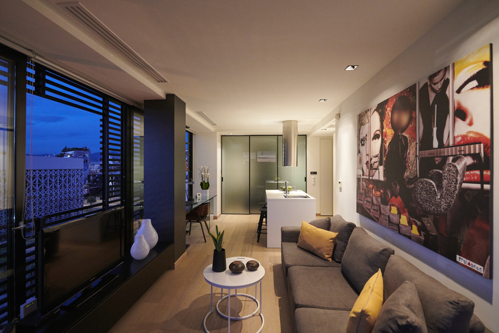 It is an open plan apartment consisted by one bedroom, one bathroom, a kitchen and a living room. The bedroom can be separated through very sophisticated plexiglass sliding doors that will ensure your privacy if needed. The bathroom is separated by a modern glass door.