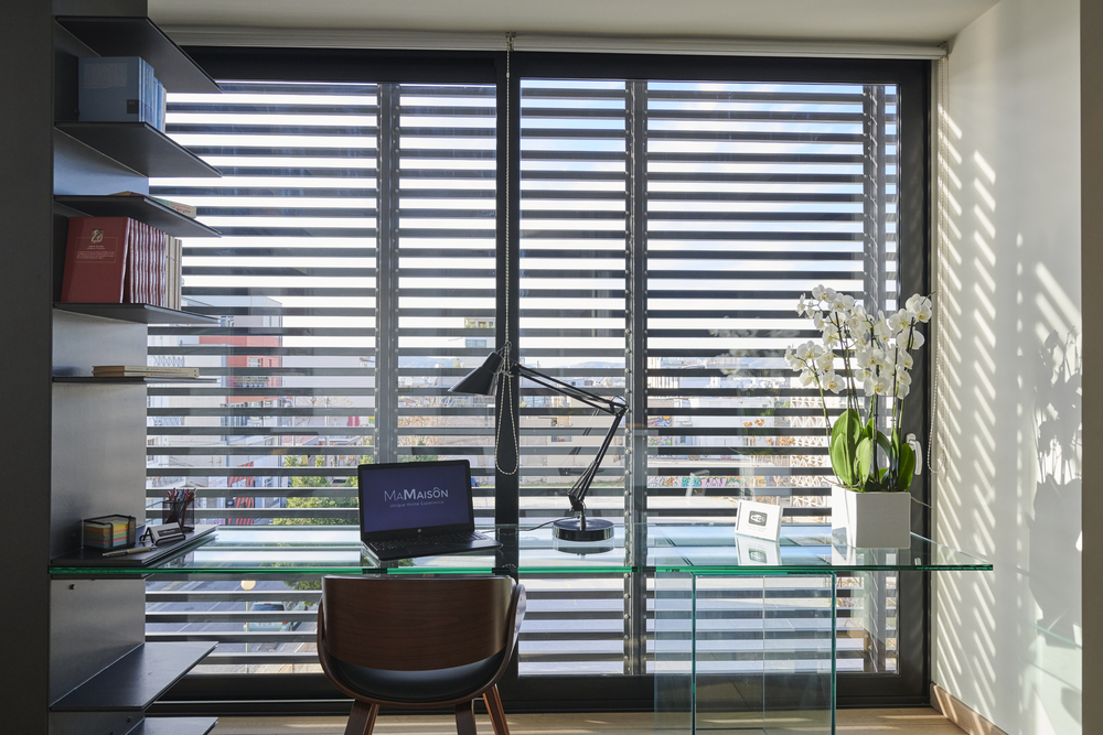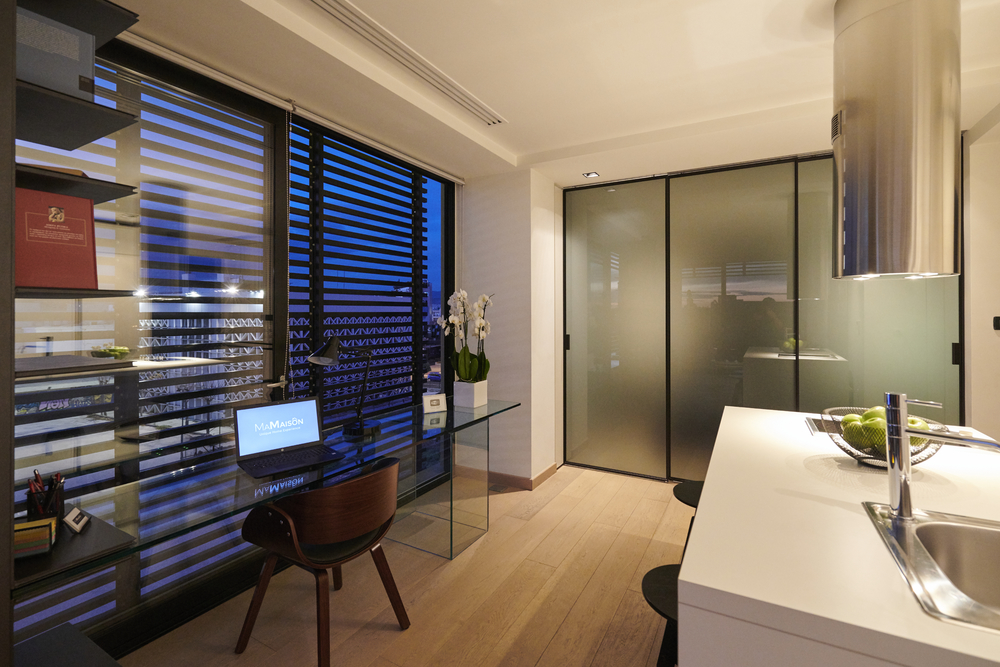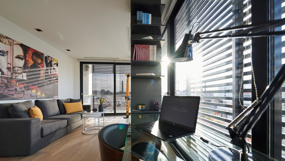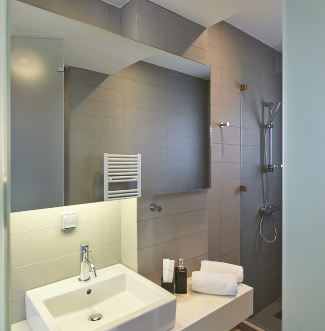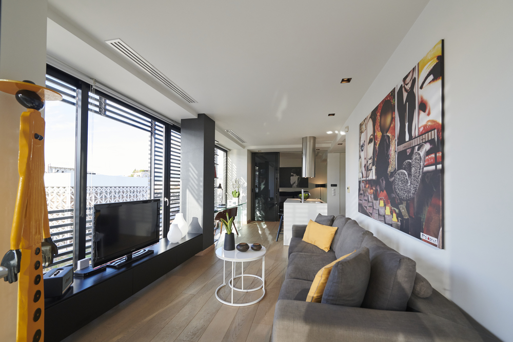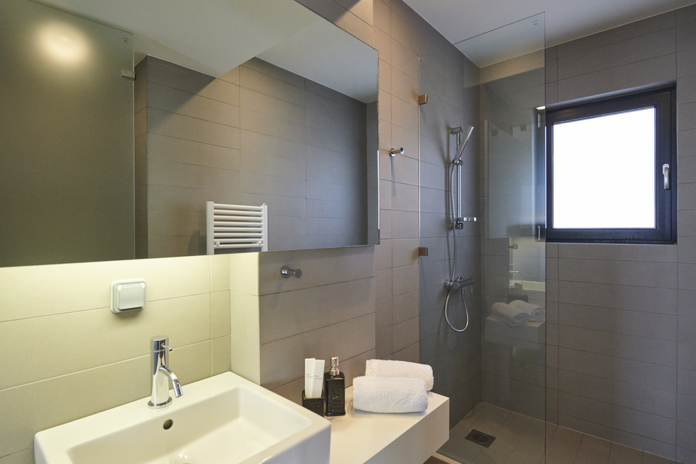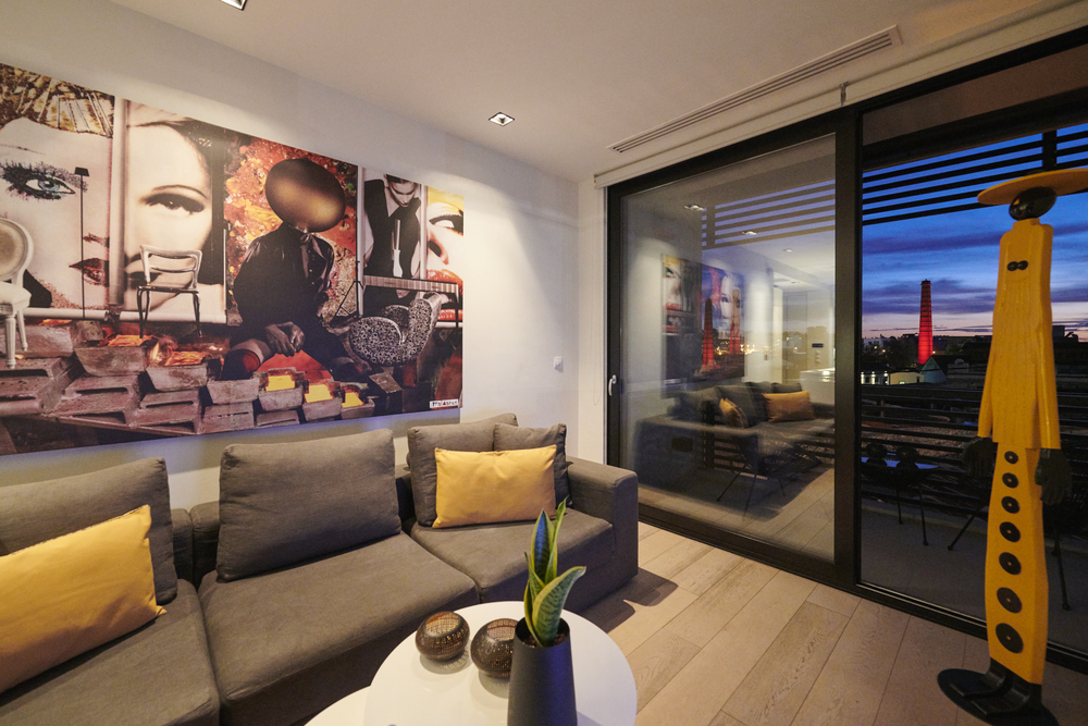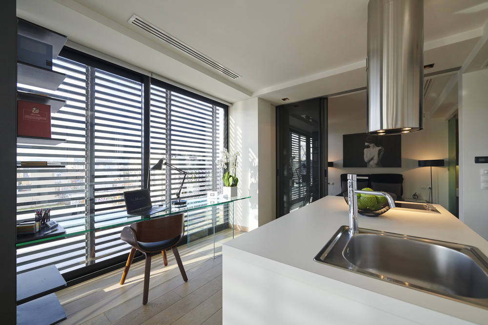 It is an open plan apartment consisted by one bedroom, one bathroom, a kitchen and a living room. The bedroom can be separated through very sophisticated plexiglass sliding doors that will ensure your privacy if needed. The bathroom is separated by a modern glass door.