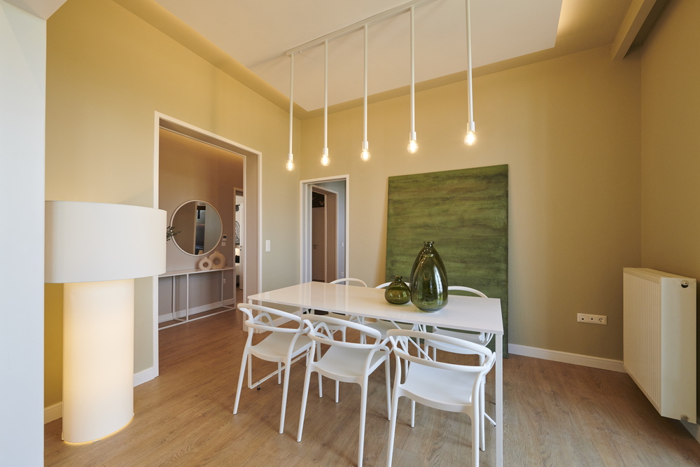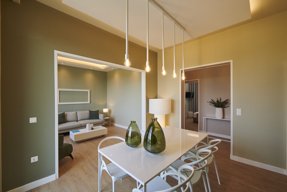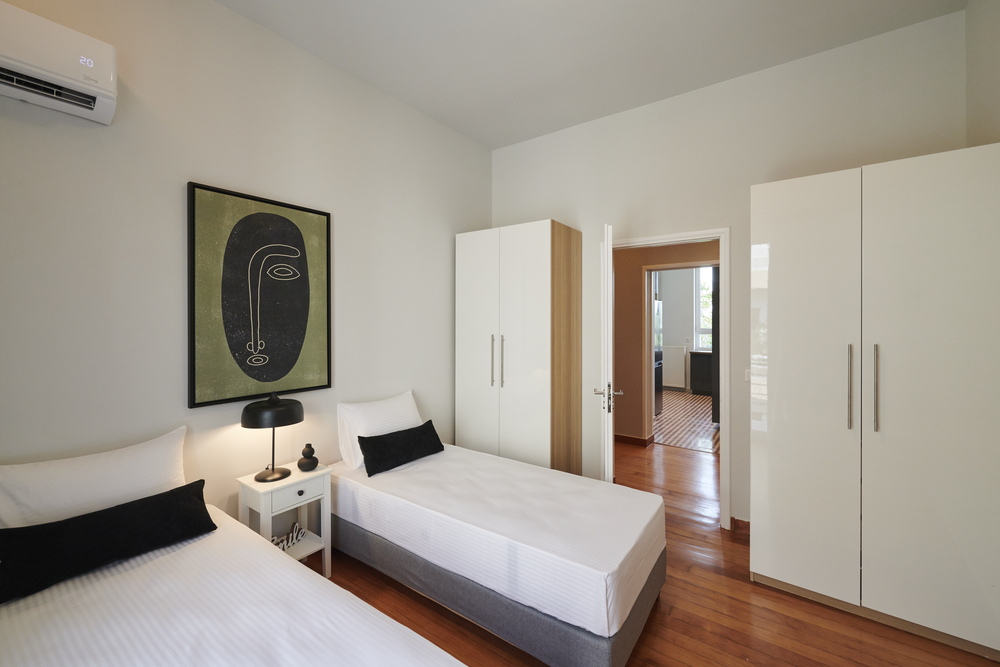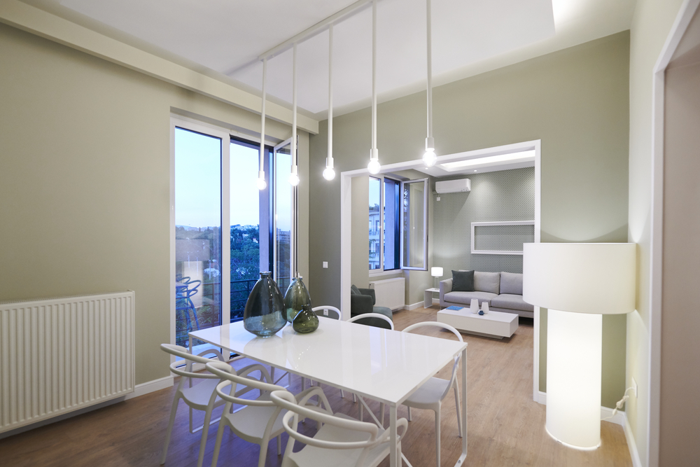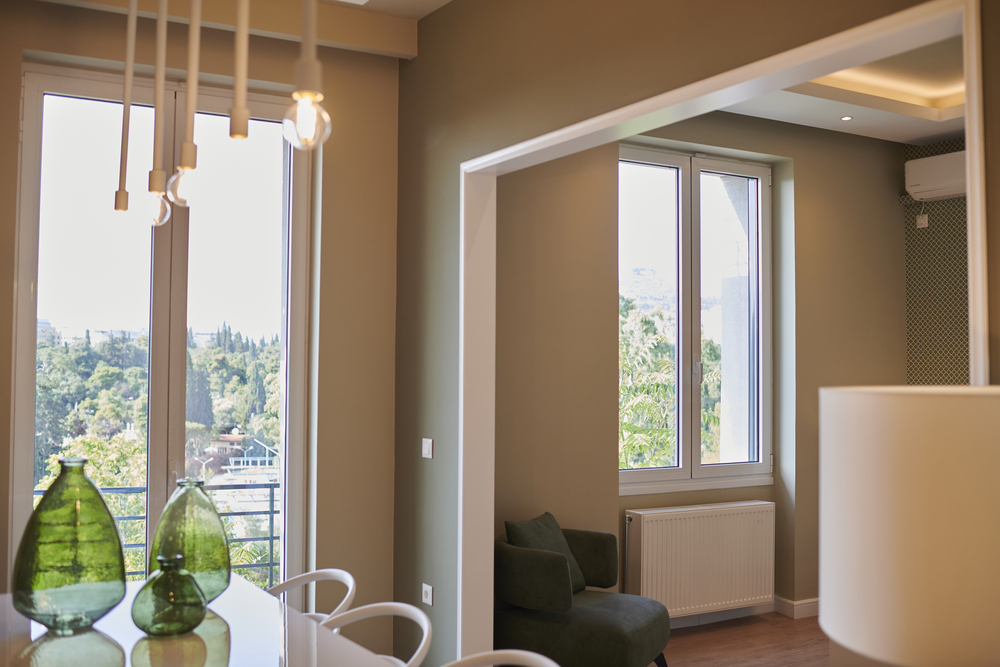 This is a 110m²(1184 square feet) ground and first floor suite, situated in a fully renovated grand historic neoclassical house of 1930 with high ceilings consisted by one living room, one dining room, one kitchen, one big hallway, three bedrooms, and two full bathrooms (one bathroom has a jetted shower cabin for hydro massage). The house is built at the foot of a hill so the suite is on the ground floor from the side of the street and on the first floor from the side that overlooks Acropolis and the temple of Zeus. Just in front of the house there is an archaeological site, the temple of Artemis Agrotera. It has one balcony and big openings with fantastic unobstructed views of Acropolis, Temple of Zeus, National Garden, Zappeion, Filopappou and Lycabettus Hills from the interior of the suite.