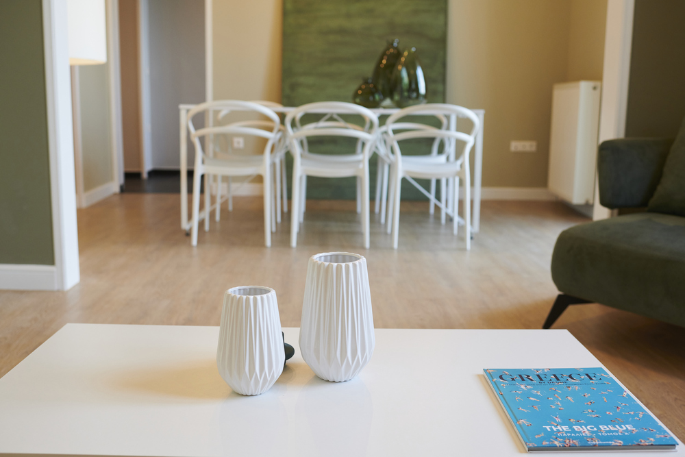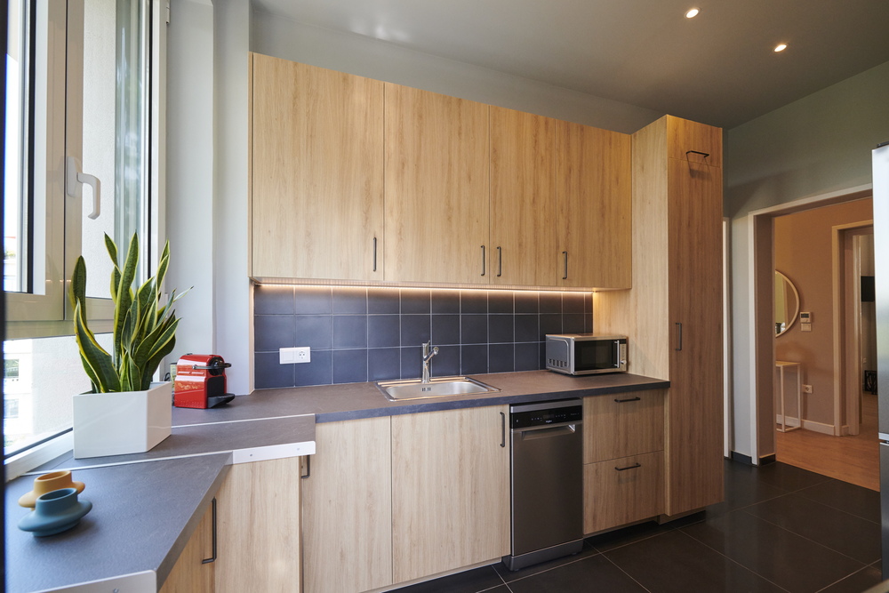- Modern kitchen with electrical appliances such as fridge with freezer, oven with hobs, coffee machines (Nespresso and filter), toaster, boiler. There are pots and cutleries, dishes, glasses, teapot, coffee kit and coffees (Nespresso and filter), sugar, tea (special kinds of Greece),