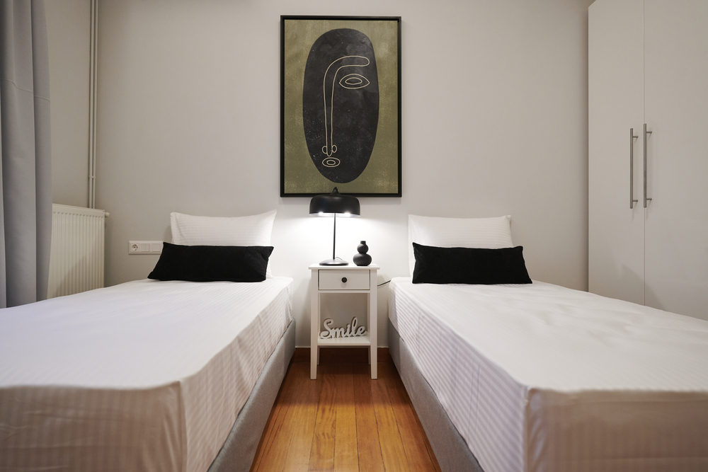 - 1 Bedroom with two single beds with anatomic mattresses, pillows and all-weather quilts. There is a large closet with hangers for your clothes and personal items,