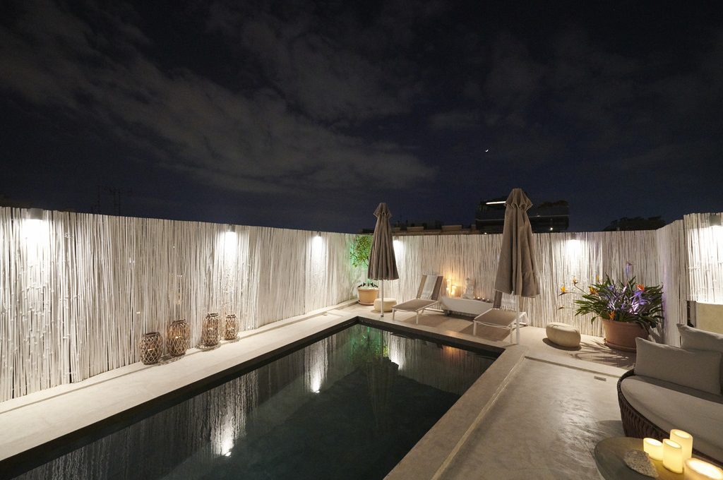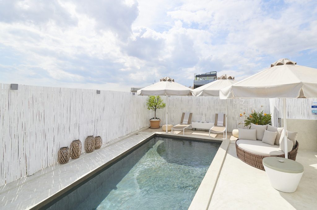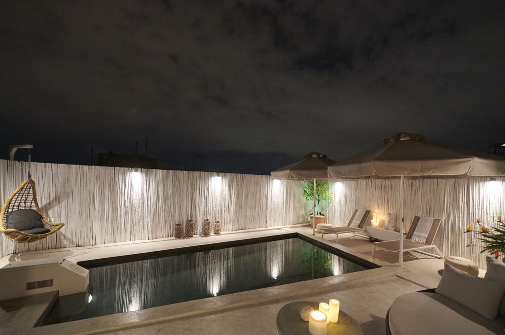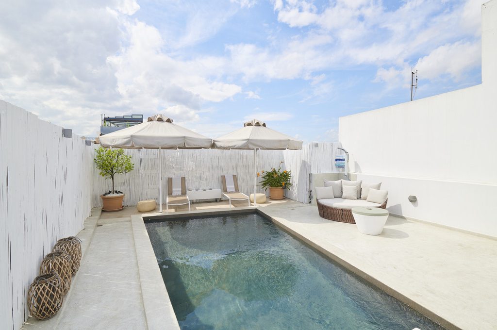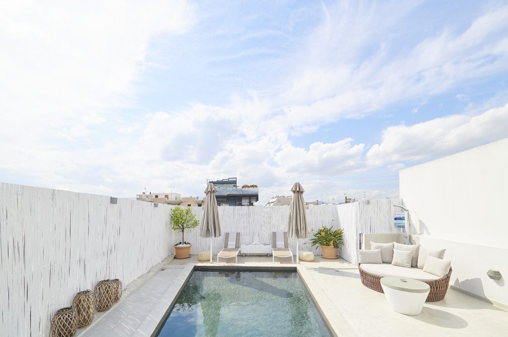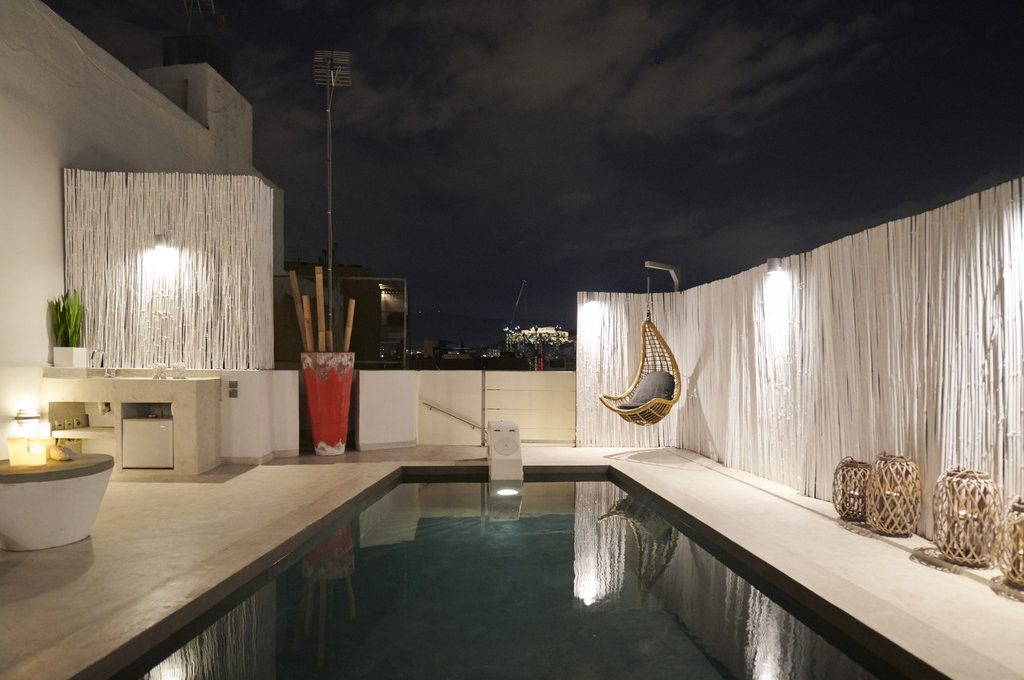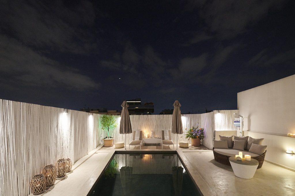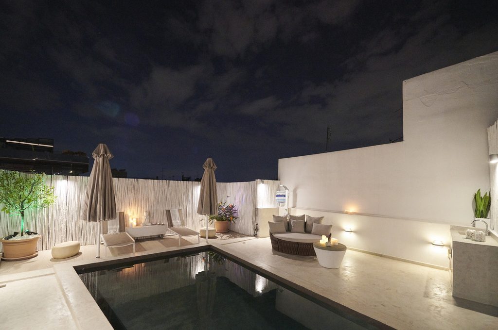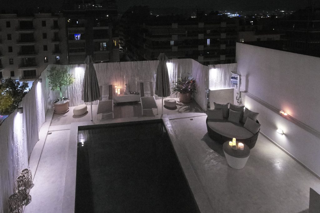 It is a two-storey loft with internal staircase and high ceilings consisted by one living room, one kitchen, one bedroom, one bathroom and a WC. It has enormous balconies in every level and it’s unique feature is the private pool on the roof garden that can be accessed through the top balcony.
