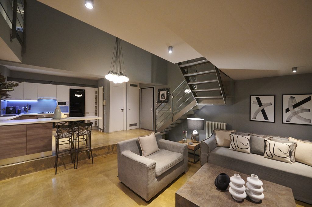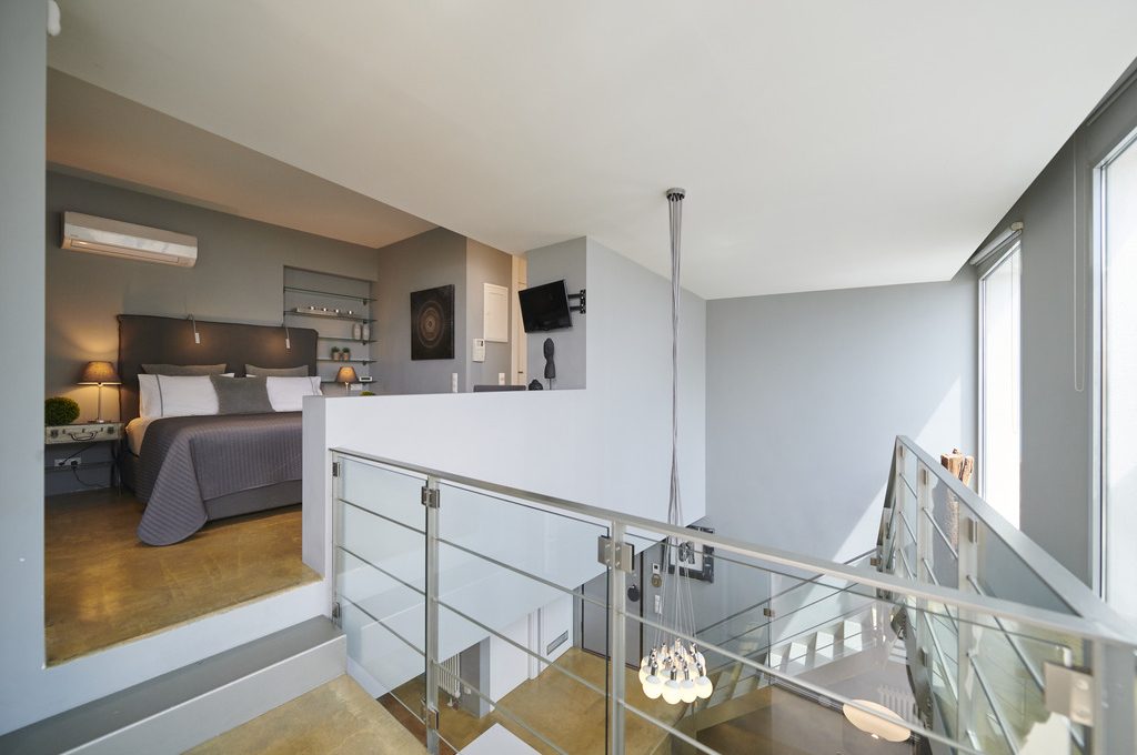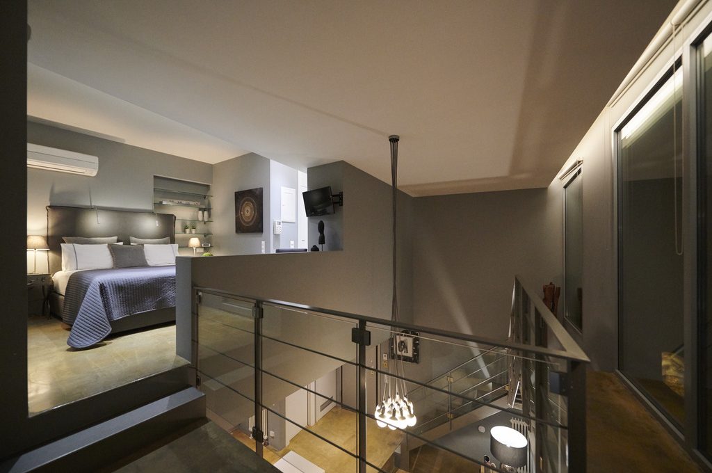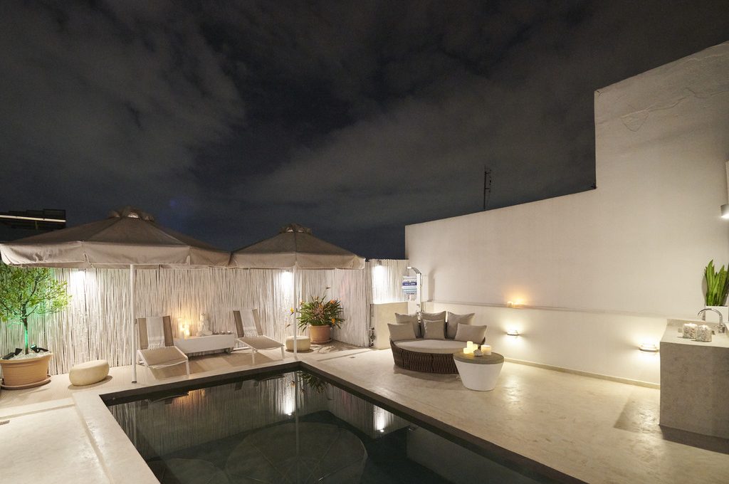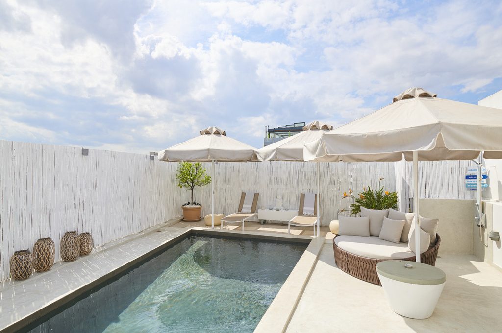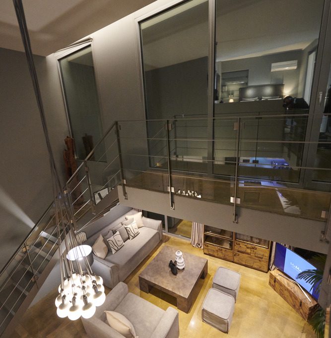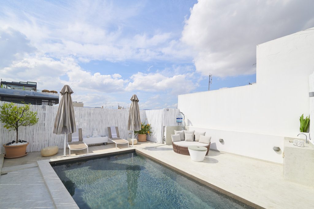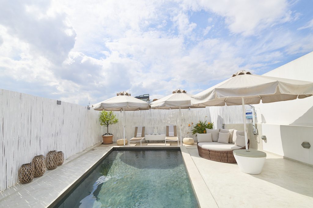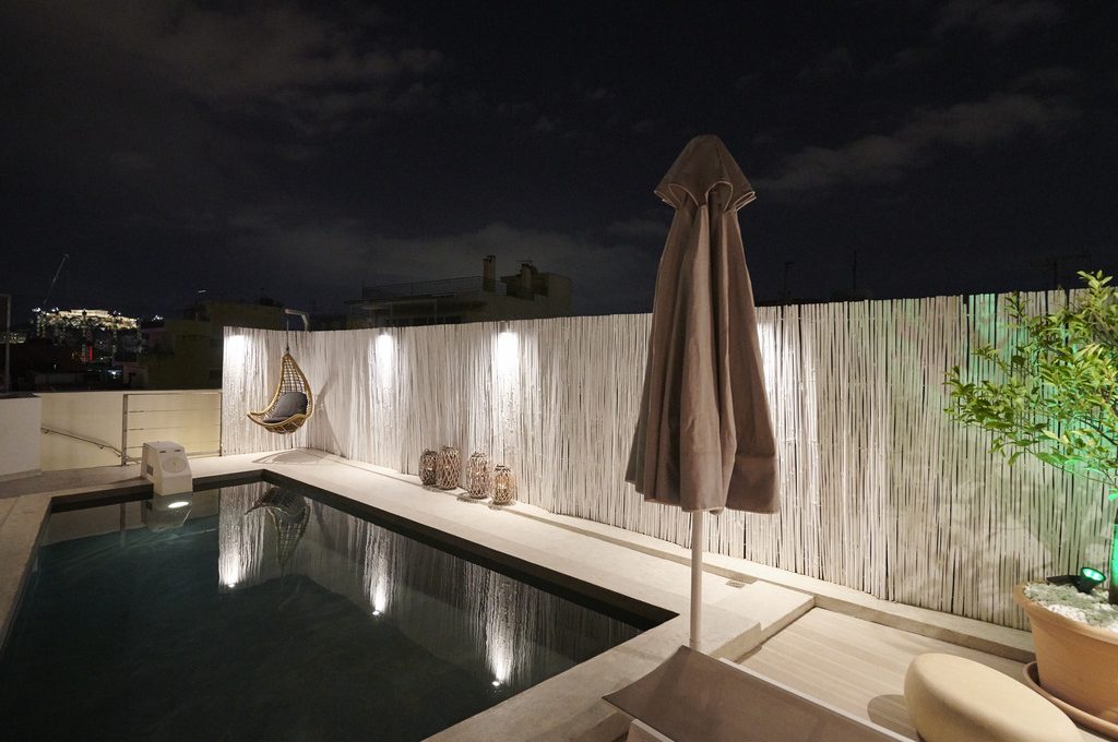 It is a two-storey loft with internal staircase and high ceilings consisted by one living room, one kitchen, one bedroom, one bathroom and a WC. It has enormous balconies in every level and it’s unique feature is the private pool on the roof garden that can be accessed through the top balcony.