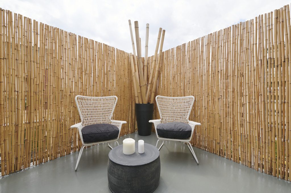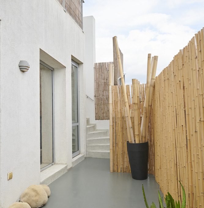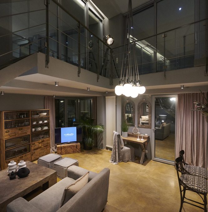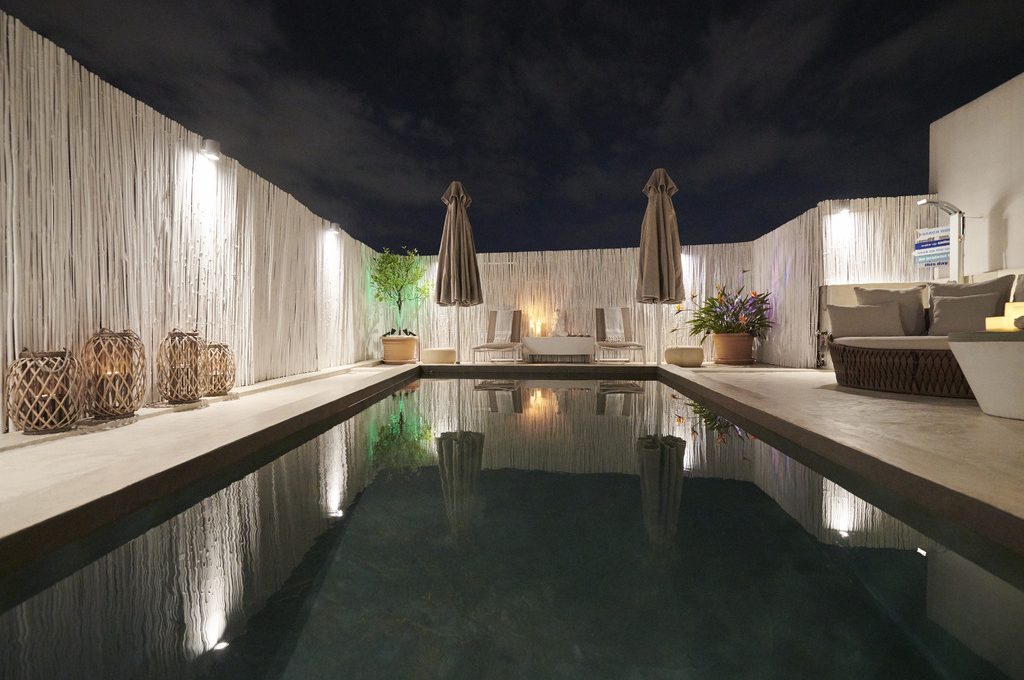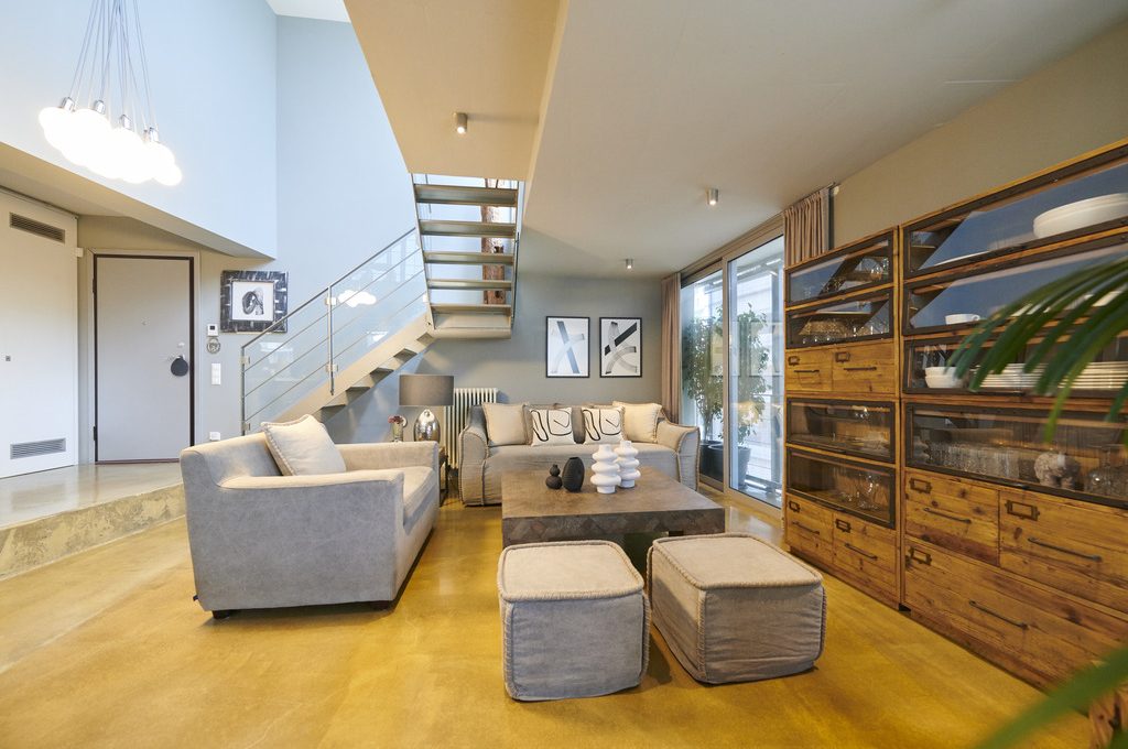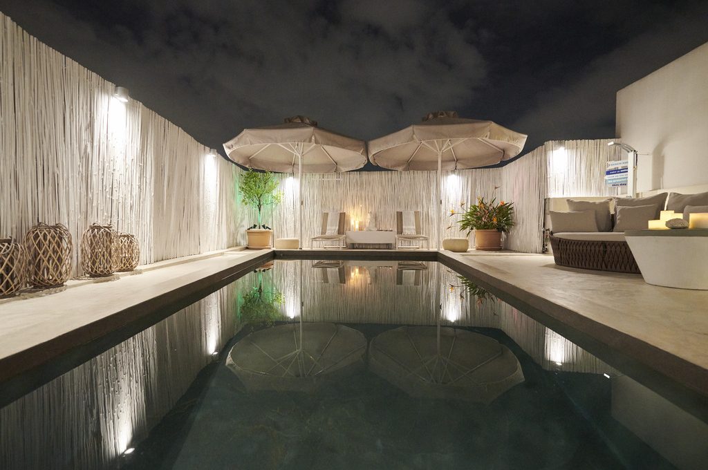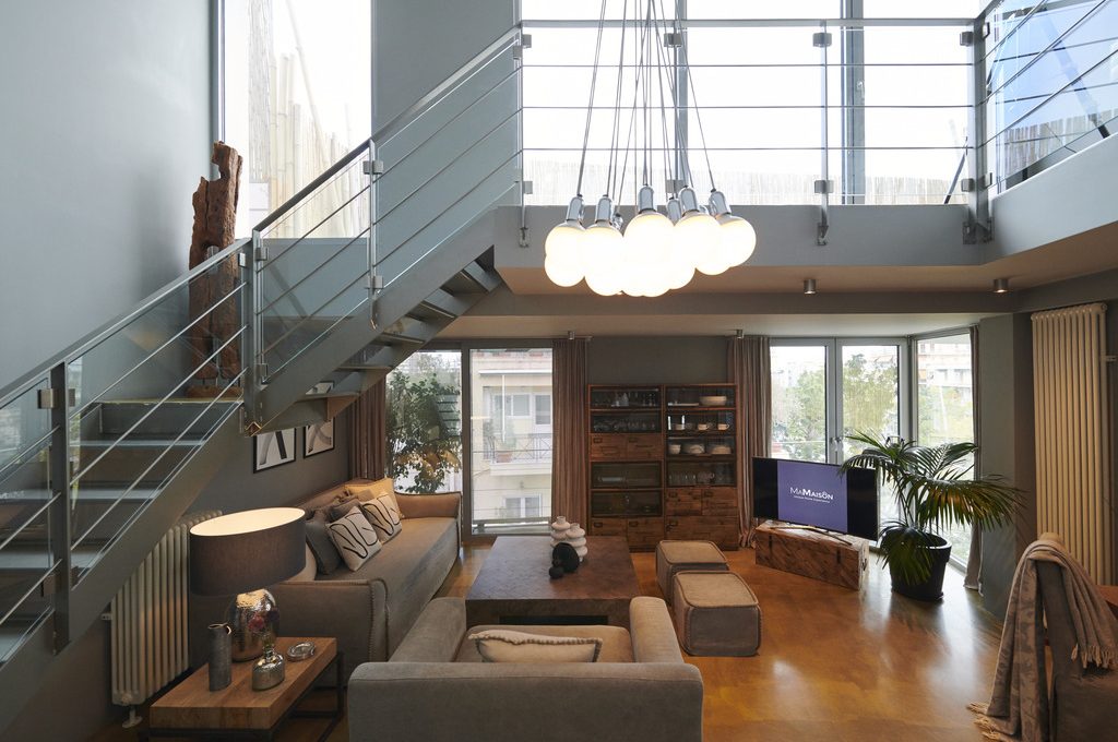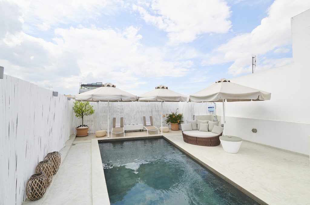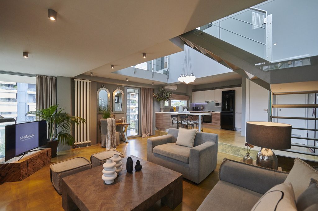 It is a two-storey loft with internal staircase and high ceilings consisted by one living room, one kitchen, one bedroom, one bathroom and a WC. It has enormous balconies in every level and it’s unique feature is the private pool on the roof garden that can be accessed through the top balcony.